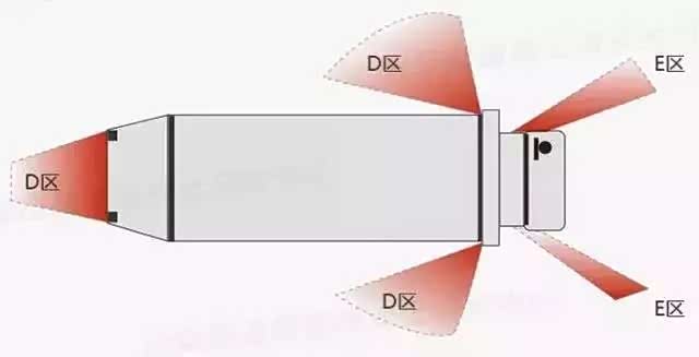 D、E区域为全盲区,在这些区域,司机完全看不到。D区域在司机直接视线范围、三个后视镜视线范围以外。E区域由于挡风玻璃左右的A柱挡住司机的视线范围形成的。