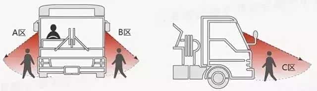 A、B、C区域为半盲区,半盲区的危险范围视大货车的尺寸而定。靠近车体下方会进入半盲区,越靠近,越不容易被大车司机发现。