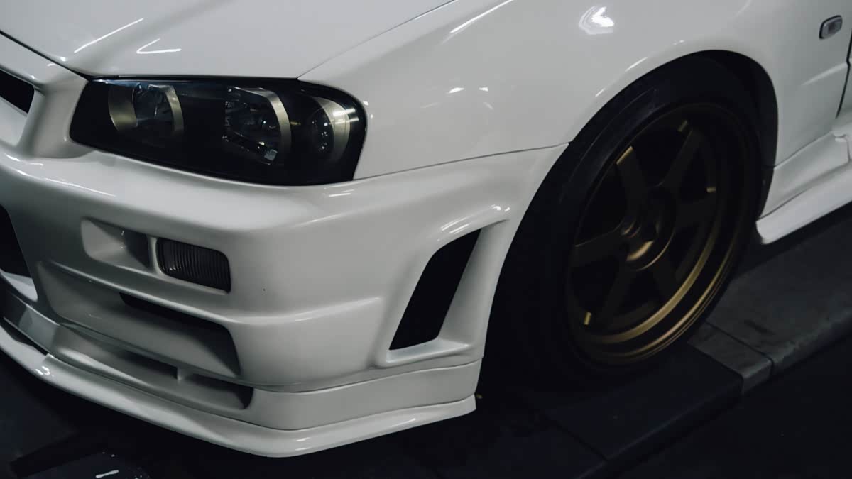 普通版R34 GT-R外观已经满足不了Jeff,为了营造凶悍的车头状态,采用Vspec 2版本的前杠,而外翻的叶子板及夸张开口的机盖,则是Z-Tune版本的式样。