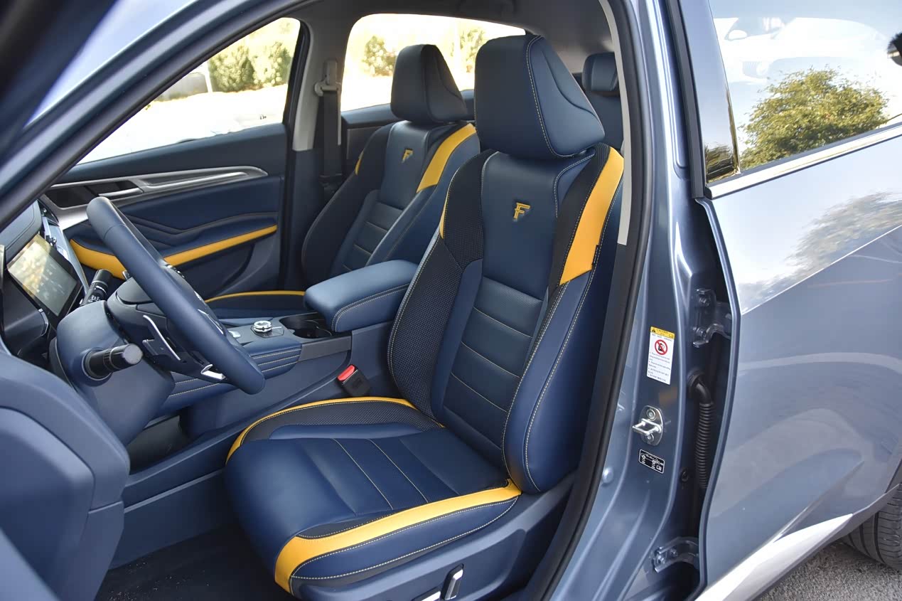 哈弗F7x性能版的座椅采用黑/蓝/黄三色拼接而成,材质由真皮及摩擦力较强的纤维组成,在视觉上显得个性十足,座椅内部的填充物较为柔软保证了乘坐舒适性。