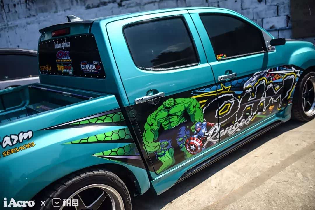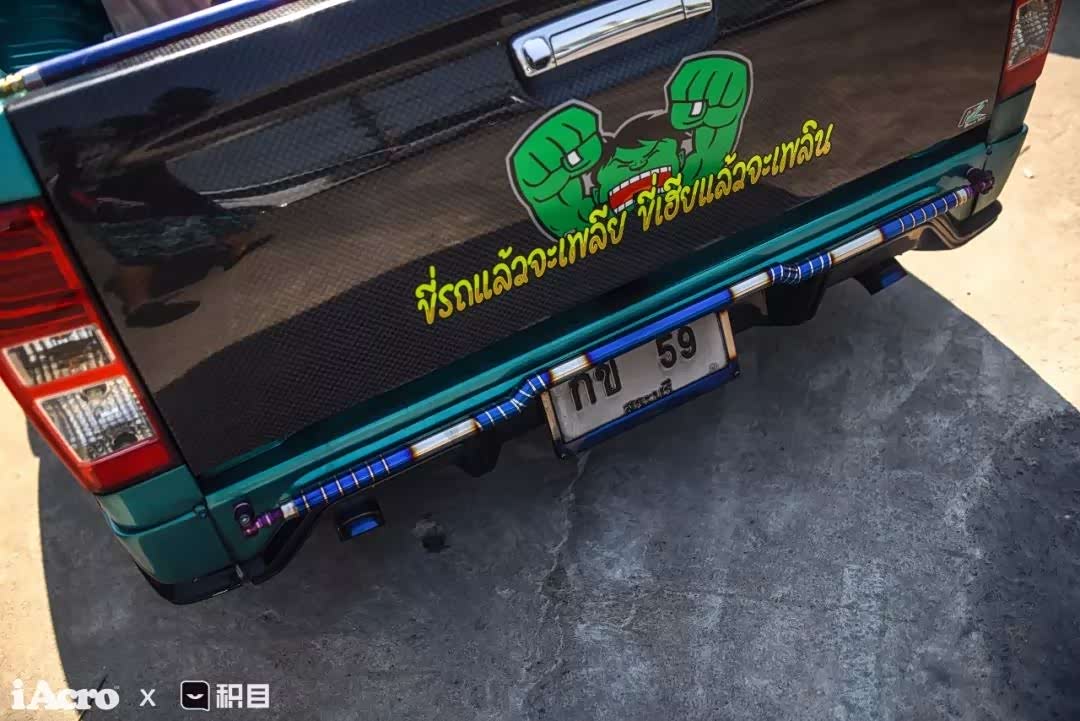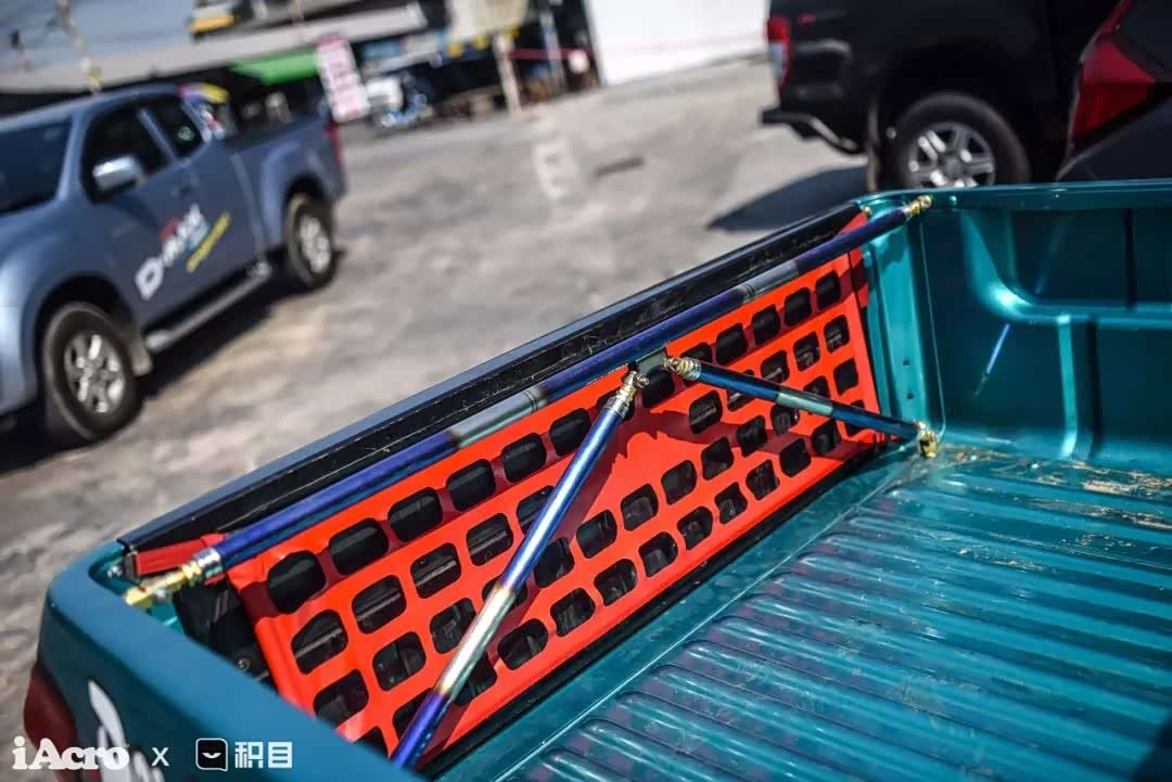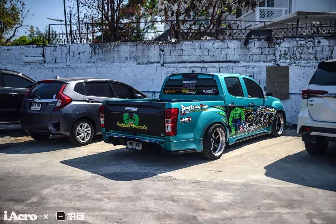 在停车场就遇到了一台颇具代表性的二代五十铃D-MAX,低矮的车身、饱满的轮圈数据、尾箱内结构各异的拉杆与这身色彩鲜艳的绿巨人涂装,这就是当地最受众的改装风格之一