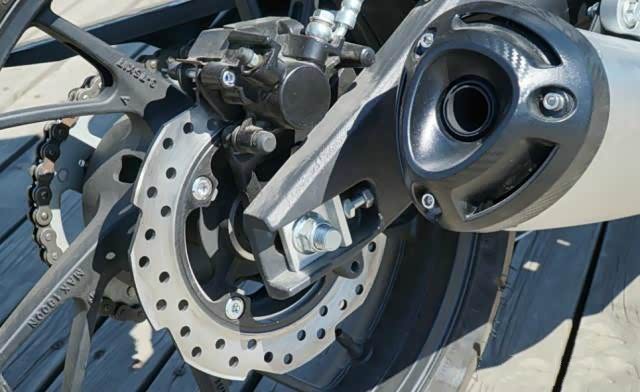 在安全制动上,前刹车采用297mm刹车盘匹配双活塞卡钳,后单刹车盘搭配单活塞卡钳,比较遗憾的是,这款车并没有搭配ABS系统。不过当小编看到这款车的后平叉的时候,感觉设计比较单薄,看起来有几分担心。不过排气的设计还是比较不错的,上面装饰了碳纤维。
