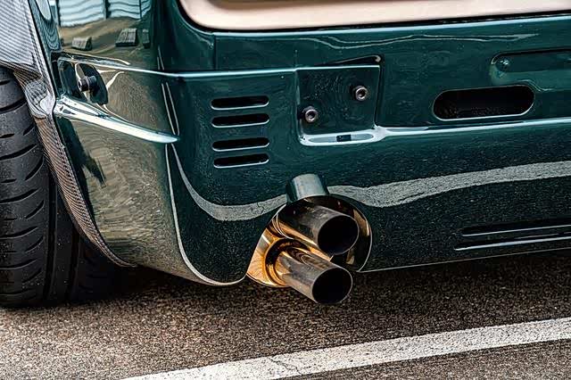 从正面看,改装后的保险杠与低挂式碳纤维前唇融为一体,并打入铆钉加以坚固。古老的前大灯进行了改装,相比70年代的技术,大灯亮度更强,安全性更高。