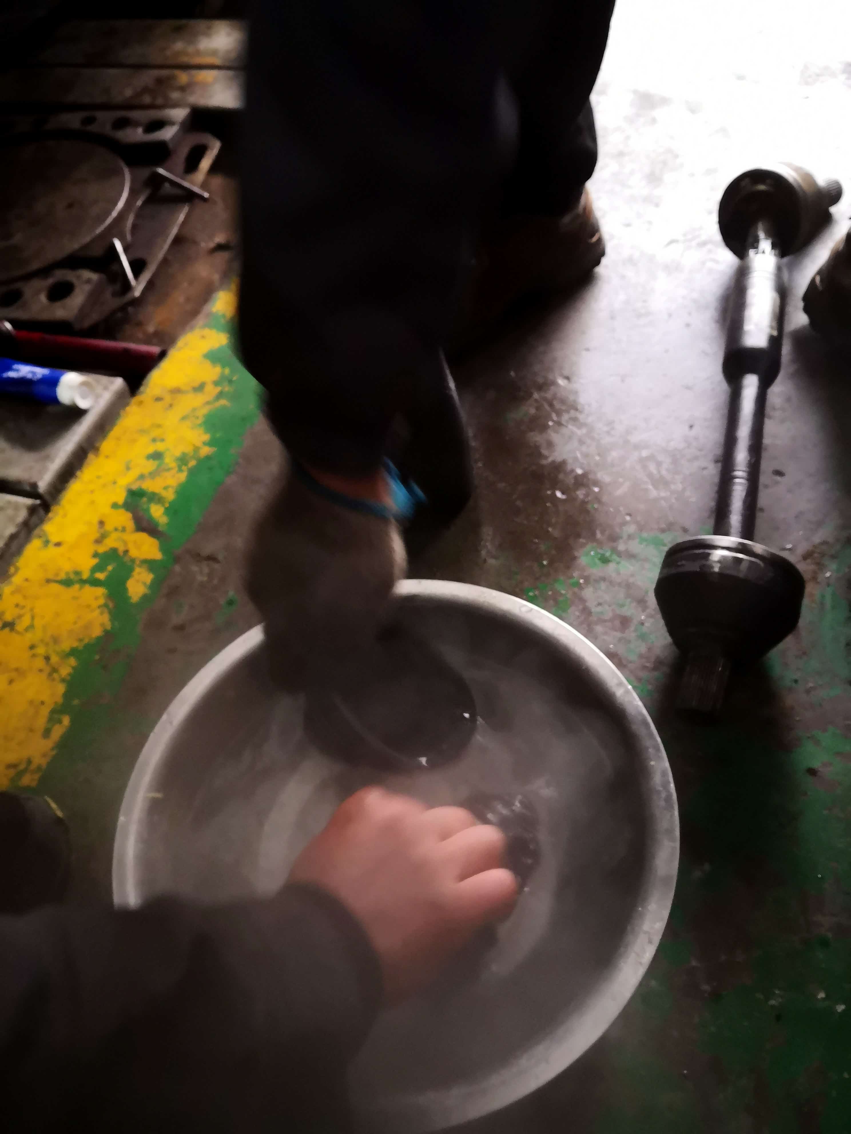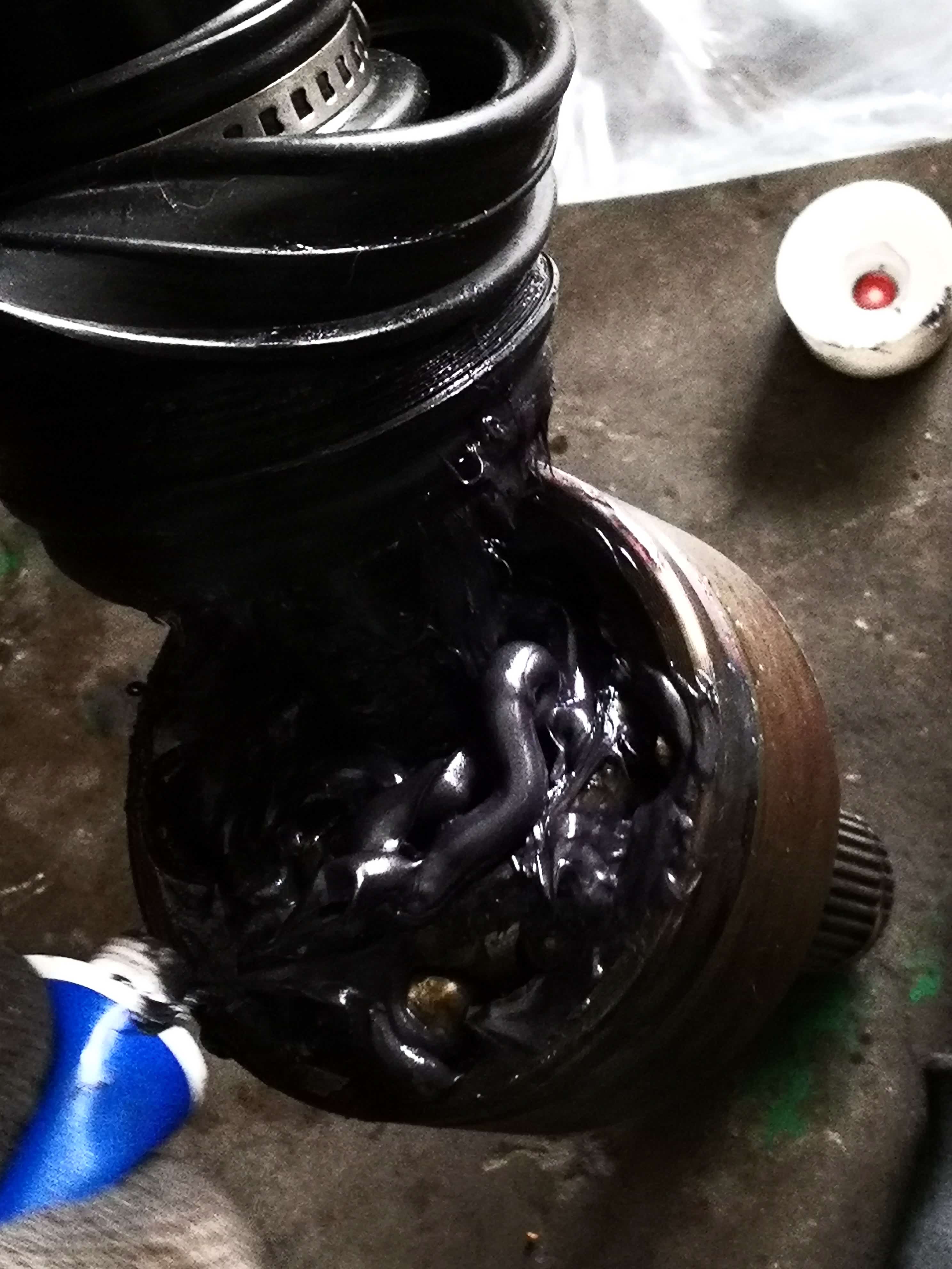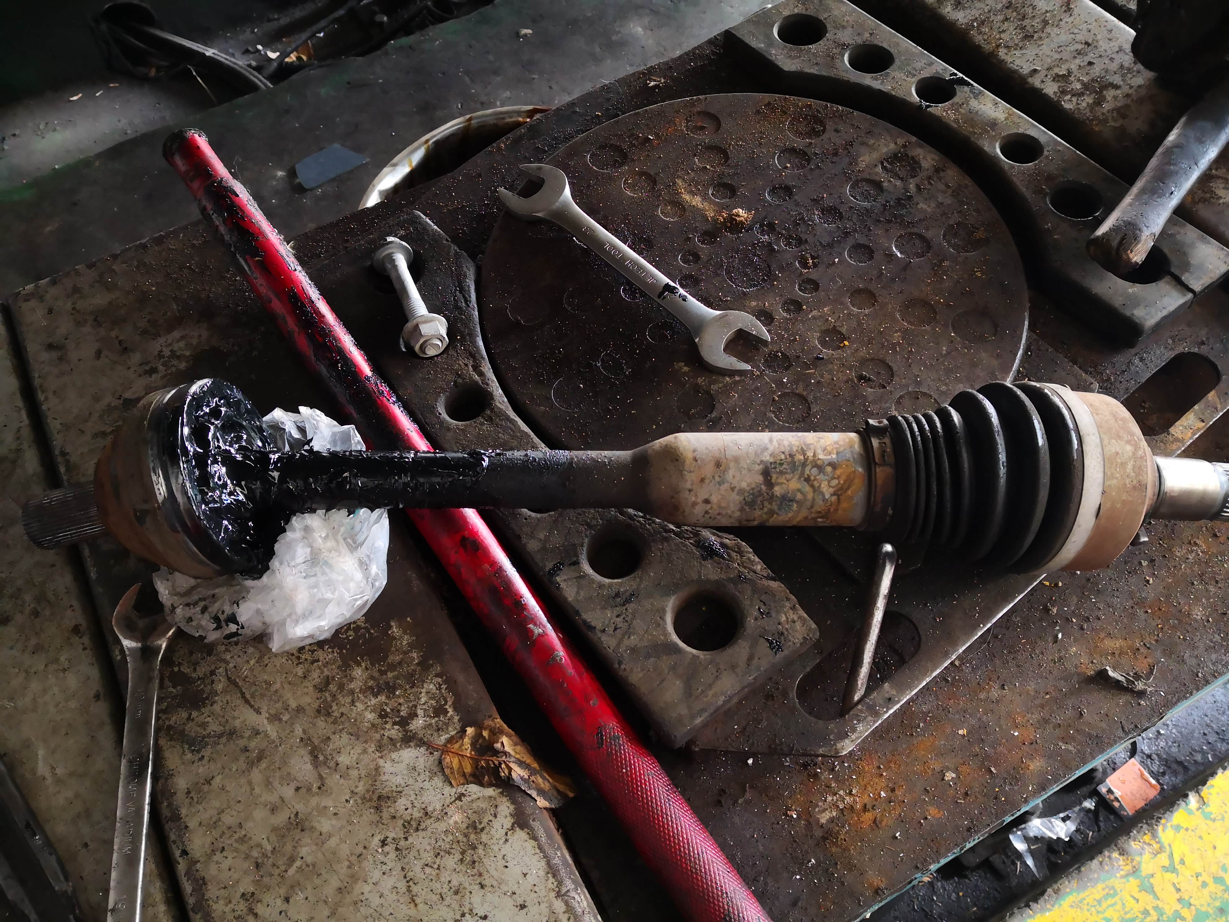 割开球笼套不难,拆半轴得费点劲,先清理了油污,之后仔细检查内部可以看到球笼并没有过度磨损,只需要更换球笼防尘套就可以。