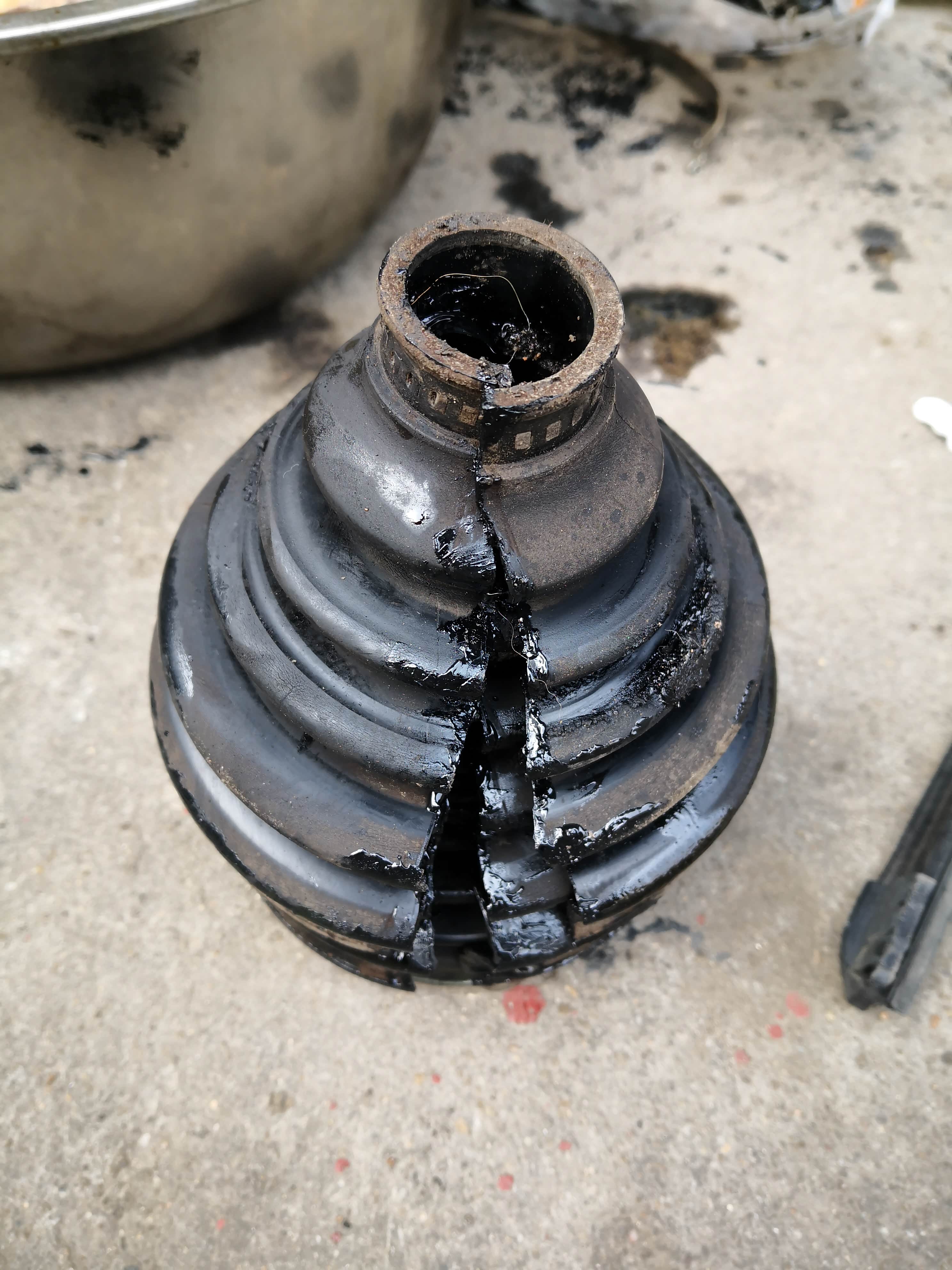 采用这种方式,不大一会儿,四个球笼套都套上了。之后要把润滑脂完全挤到球笼内部,套好球笼套,把卡箍卡紧。这时注意不要完全排净内部的气体,以免球笼套在冷却后完全收缩在球笼周围无法伸展,导致球笼转动时球笼套破损。