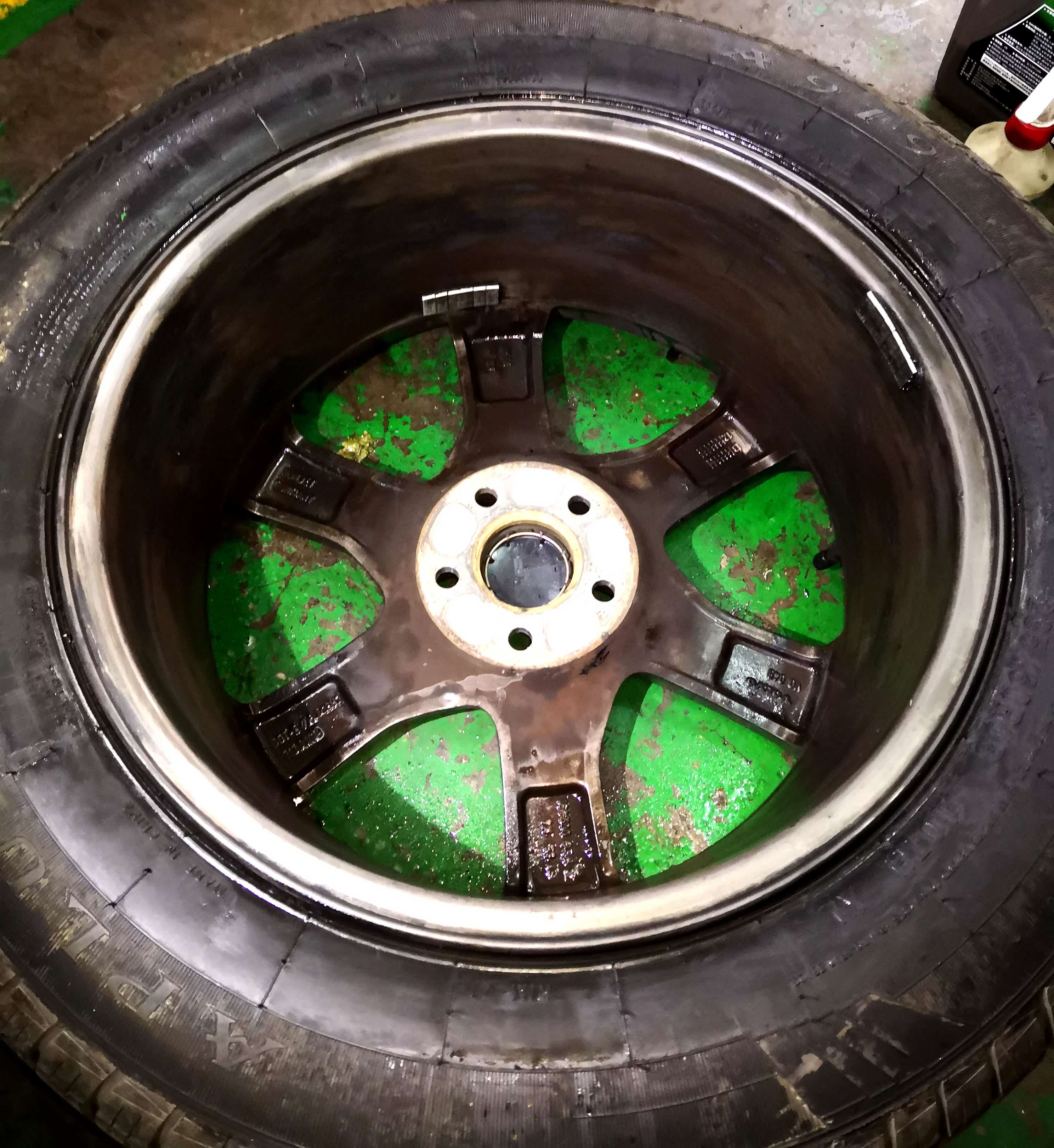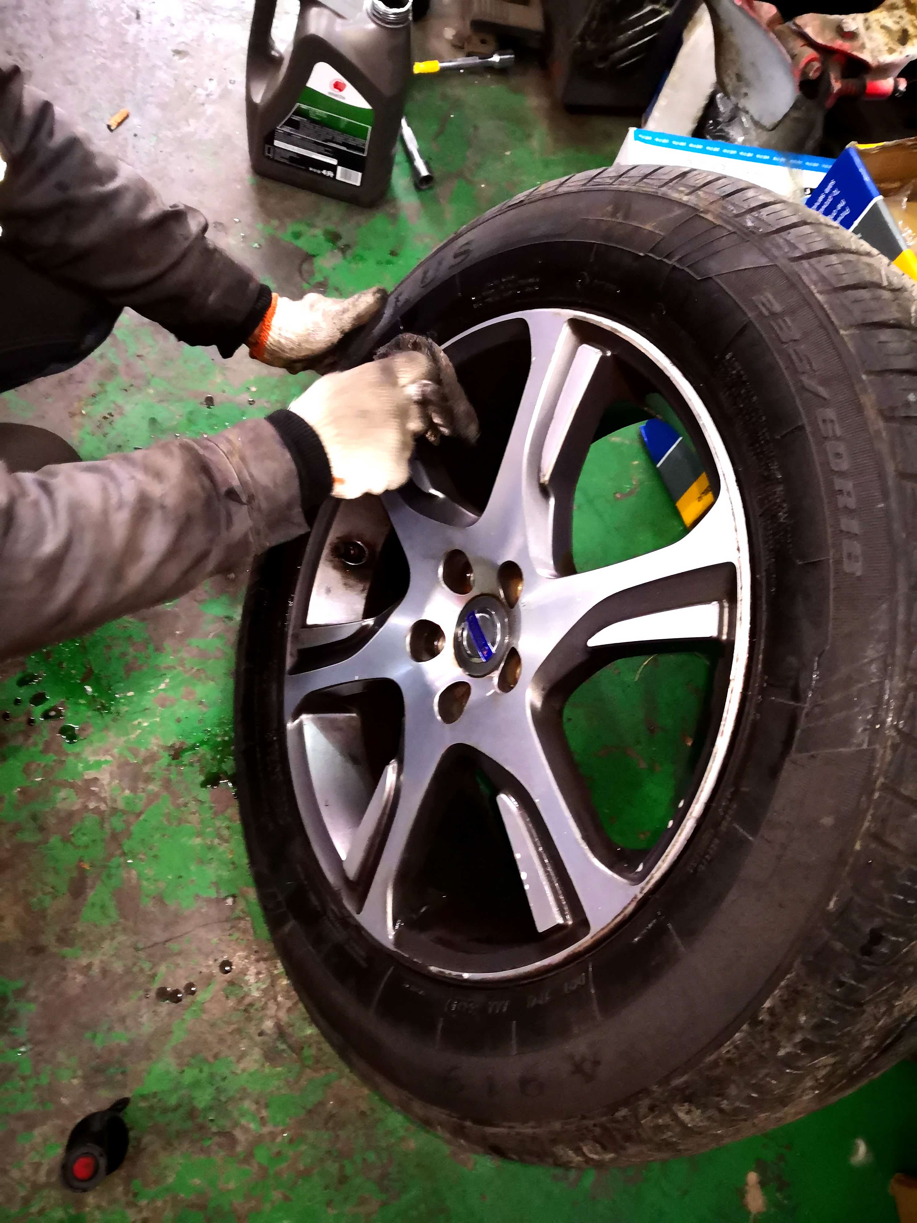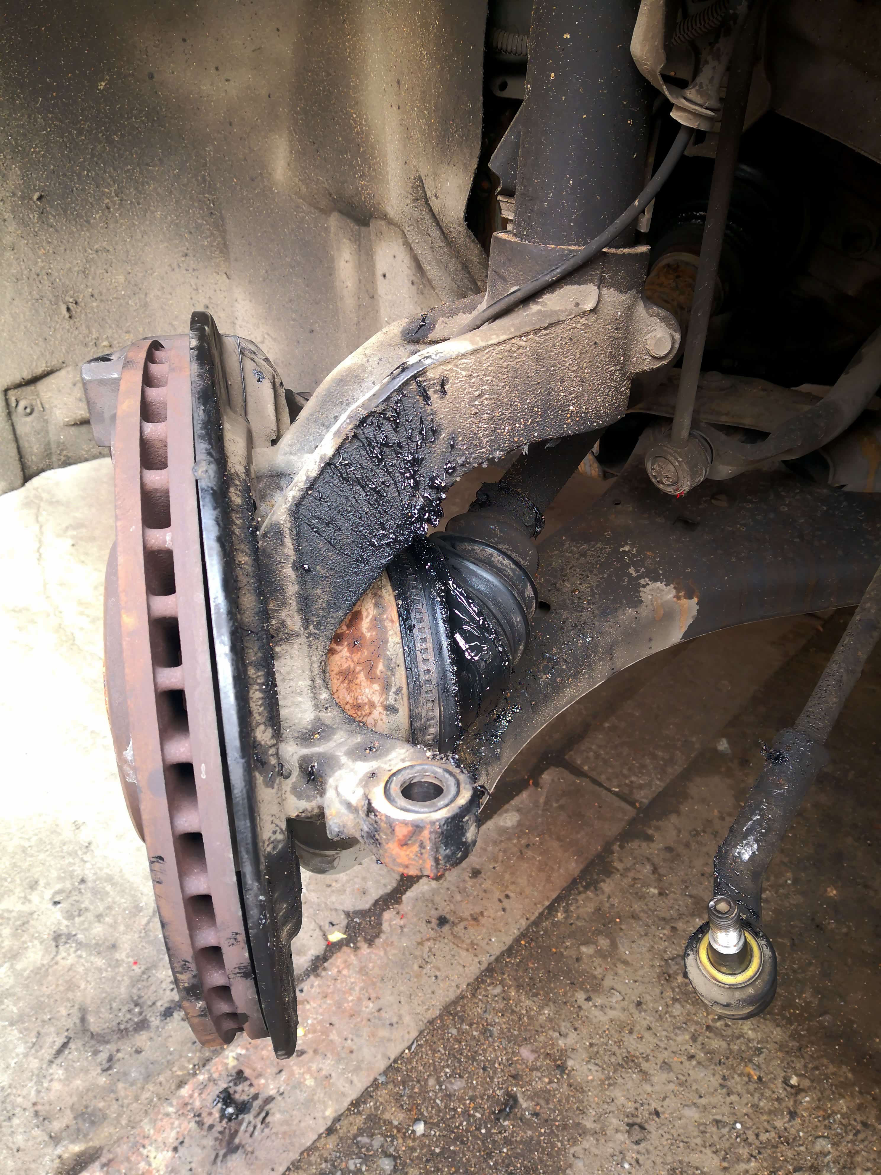 更换球笼套应该是维修技师们最不喜欢的项目之一,一是由于球笼套拆装不方便,二是会弄得满手油污,这辆XC60也不例外。轮毂、底盘悬架上到处都是甩出来的润滑油脂。