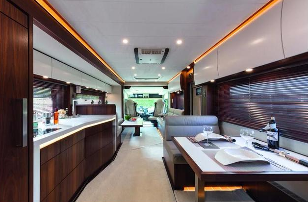 而第二类房车它的名字叫做elysium,这一对房车它的外形设计非常的时尚,是很多人喜欢的前卫风格,非常的引人入胜。并且在这一车子的顶上还有有停机坪,可以供直升机停放,更是有着浴缸以及高级的音响,在天气好的日子里,那里就是可以享受生活的好时光。在房车的内部更是还安置的有电视机以及娱乐设备,实在是一个野外娱乐的强大助手。