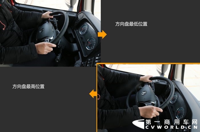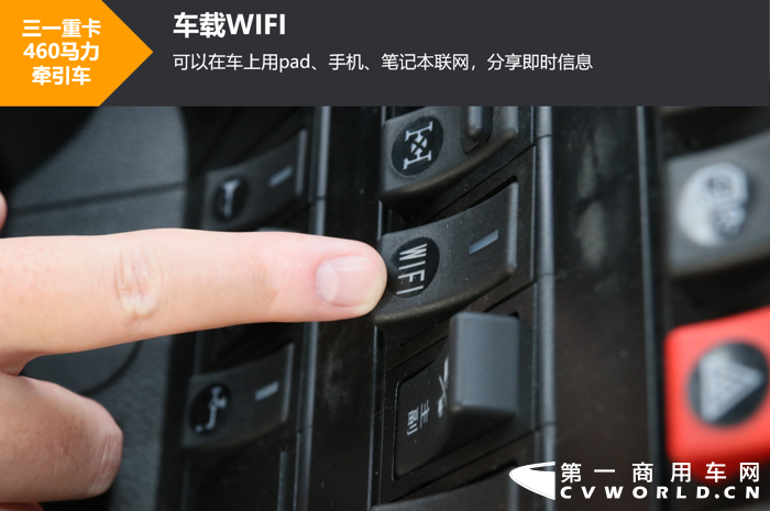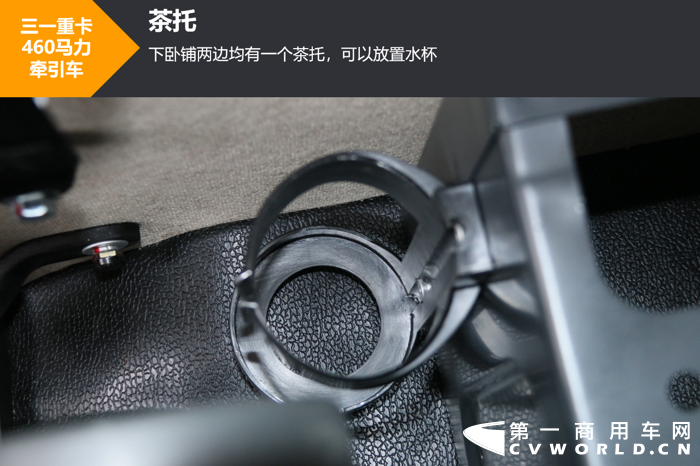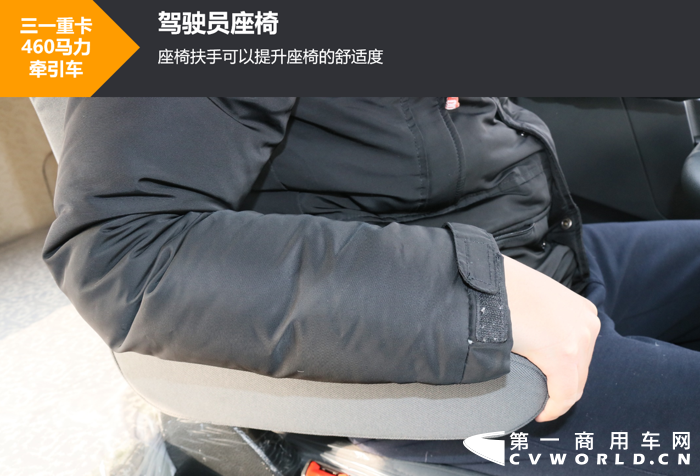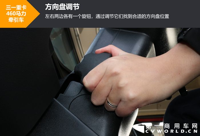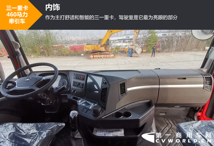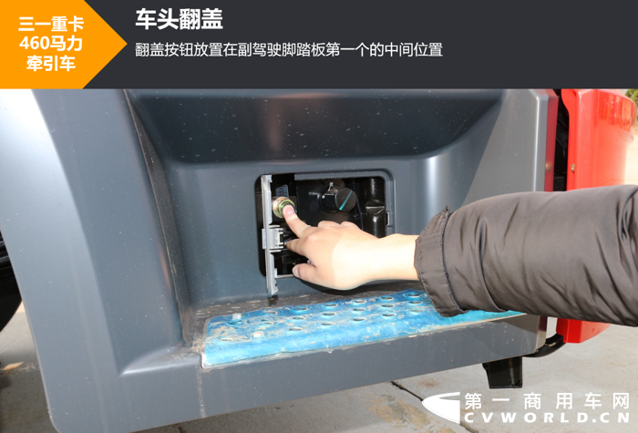 车头翻盖的设计充分体现了新车的智能化。在小编的印象里,大多数重卡的翻盖只能操作拉杆,繁琐复杂,且带有一定的危险性。三一重卡这款新车型的翻盖就简单了许多,只要打开前面板,然后再使用副驾驶第一层脚踏板中间的按钮即可。而且翻盖会缓慢的升起,既节省了体力,又不会让驾驶室内的物品损坏。