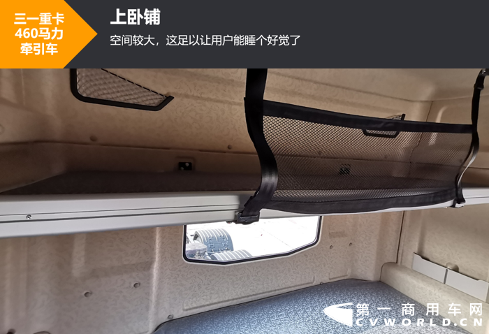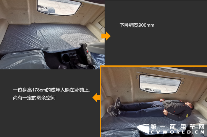 新车的卧铺分为上下两层,下铺宽度为900mm,这足以让卡友们能睡个好觉了;至于和英杰版的1.2m“超宽双人床”相比哪个更好,这就在于用户的个人选择了。