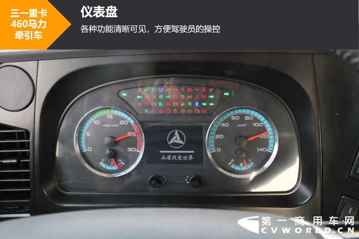 仪表盘采用传统的指针来显示发动机转速、车速以及水温和燃油量,上方的警示区域用不同颜色的符号来显示车辆正常、不正常情况,方便驾驶员查看。中间的液晶显示屏可以显示时间、电瓶电压、尿素溶液的当前剩余量、机油压力和里程等信息。