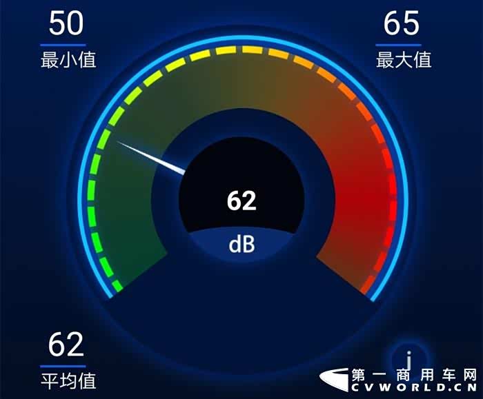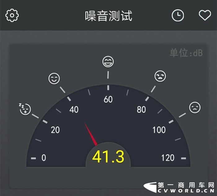 对于重卡来说,噪音控制是相当重要的参数指标。在路试过程中,小编全程进行了噪音测试。车辆行进时,噪音在62分贝左右,怠速时在41.3分贝左右。小编为了确保噪音验证的准确性,使用了两款不同的噪音测试APP,结果大同小异,都比正常交谈的声音还低,车辆静音效果不错。