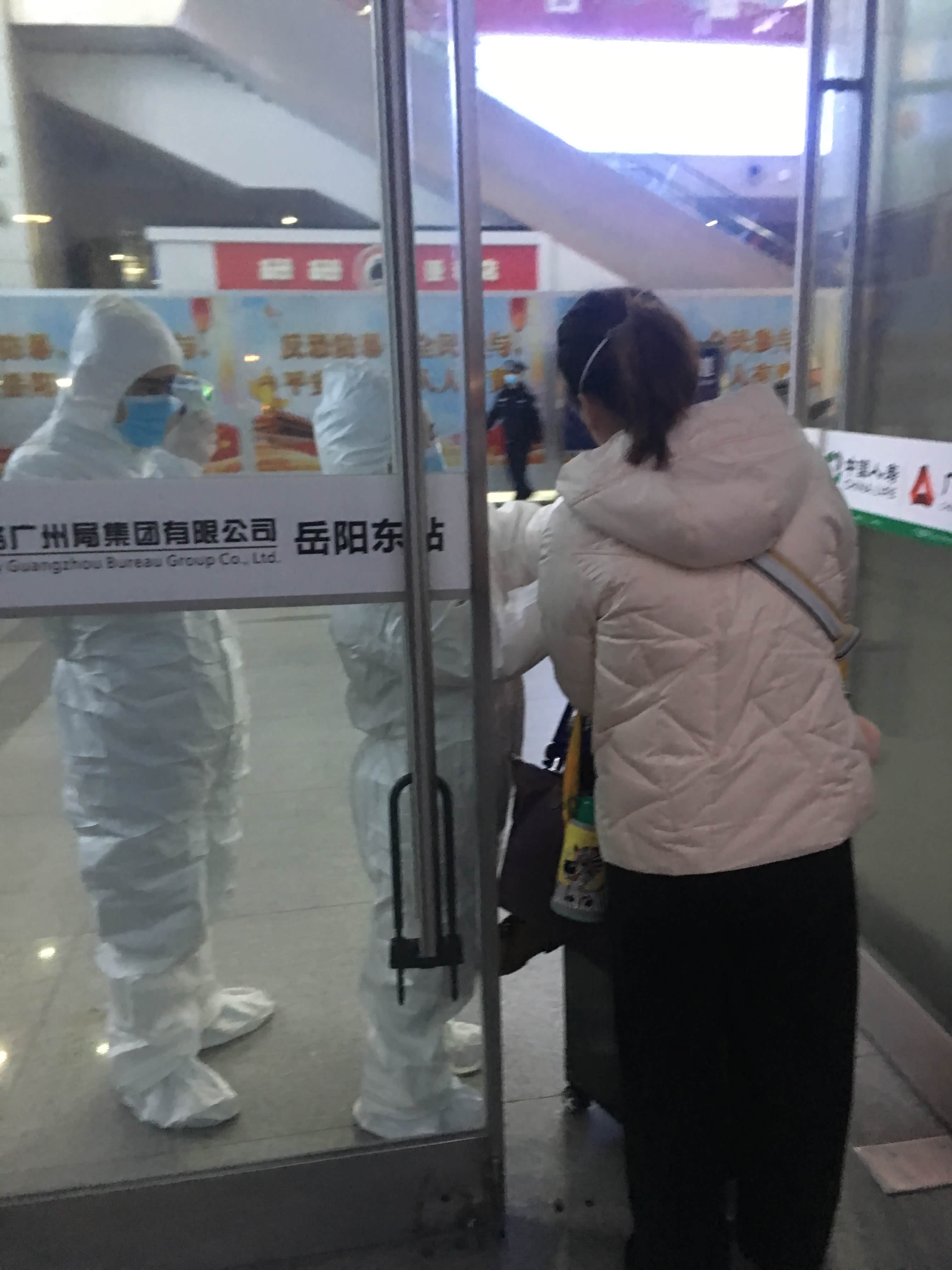 岳阳东站今天开始已经由经开区防疫部门对所有进站、出站旅客进行体温检测。