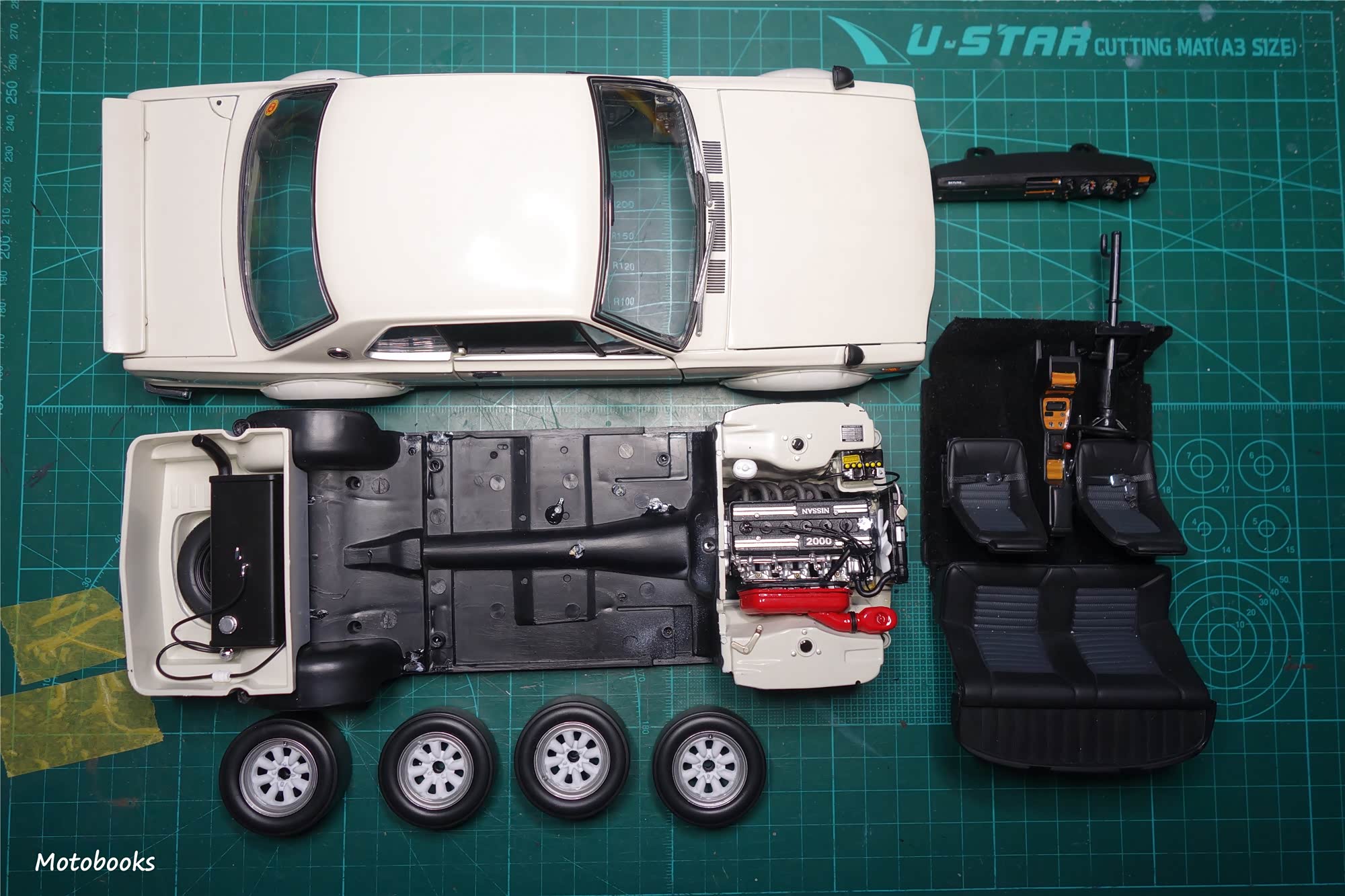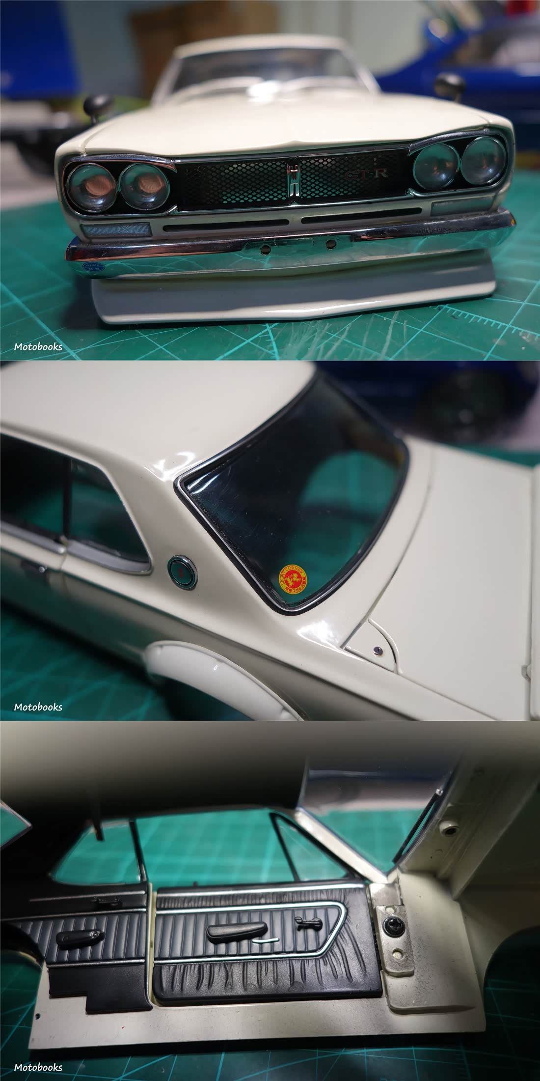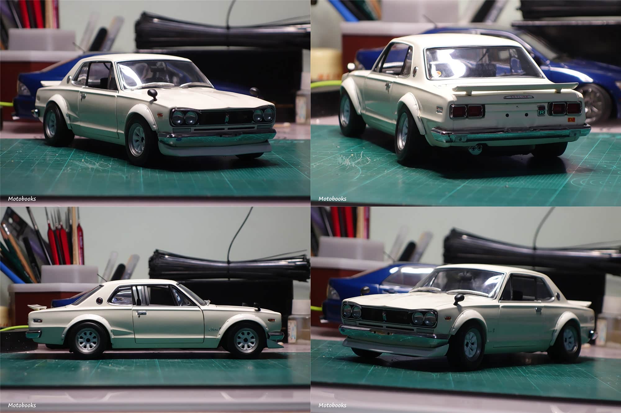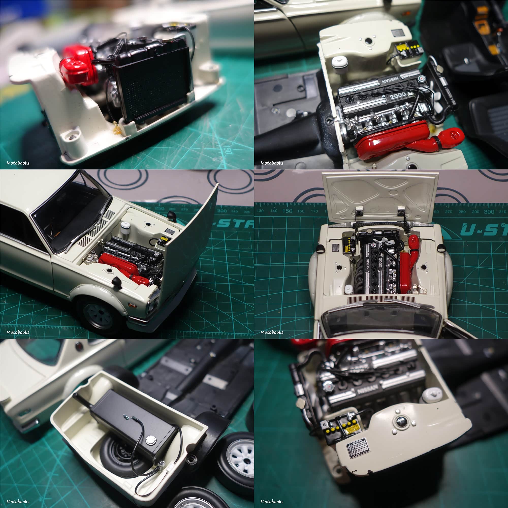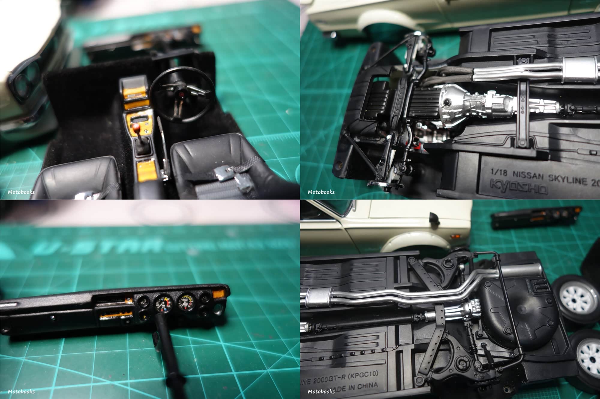 (仅限老)Kyosho 给我们的印象词是:450 块、内饰好、合金全开、实在踏实 ... 这些在 KPGC10 以及同牌同车系模型作品上都能看到。独立结构的发动机模型部分做工精巧且分件繁多,部分管线、分件涂装细节工艺甚至可比 CMC - 如果有朝一日西姆斯染指 JDM,那(老)Kyosho 真的是需要逾越的一座大山。