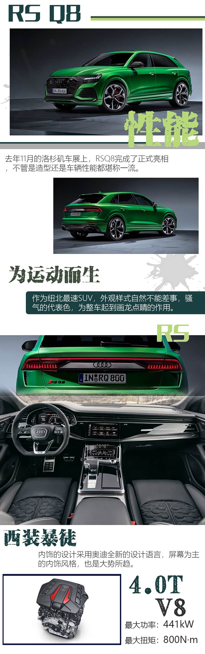 推荐理由:说到RS Q8你的第一印象可能觉得这是一台奥迪高性能部门研发的性能机器,但是对它的实力如何却不得知,但是如果告诉你它是纽北最快SUV,那你一定会对它另眼相看,是的它就是一台“性能机器”,可能有些冷血,但是这也是它的魅力所在。