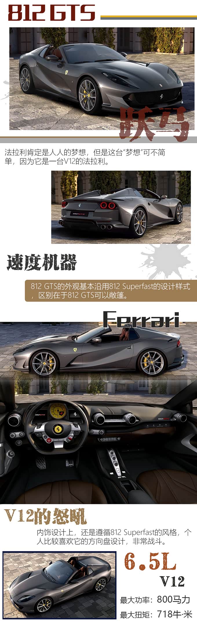 推荐理由:开头咱们说了梦想,既然是梦想就要脑洞放大,把这辆法拉利812 GTS放在最后,也算是终极梦想了,这台搭载6.5L V12发动机的怪兽,是目前法拉利的旗舰车型,拥有一辆法拉利是很多人的梦想,但是拥有一辆法拉利旗舰那岂不是终极梦想。