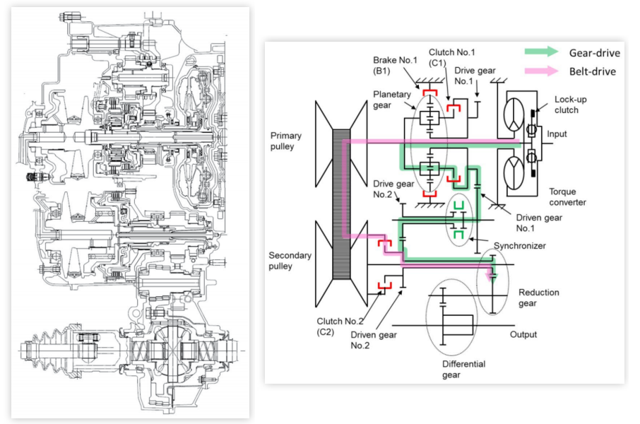 最新的丰田direct shift CVT变速箱代号K120。它创新的加入了一套一档直驱齿轮系统。当低速时通过离合器切换到齿轮驱动Gear Drive模式,动力由绿色路径所示由齿轮直接传递动力。当较高速度时通过离合器切换到带轮驱动Belt Drive模式,动力由红色路径所示由钢带和滑轮槽连续可变速比的传递动力。