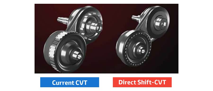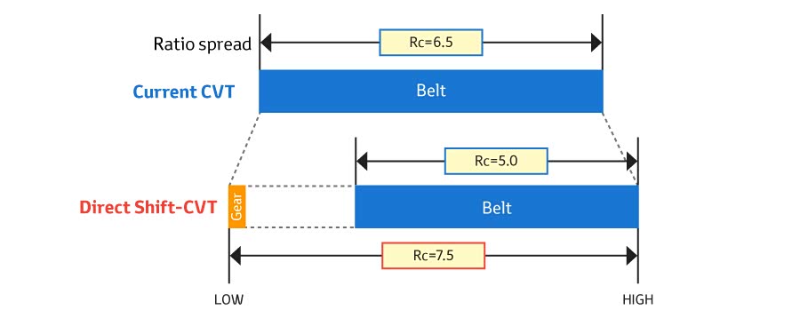 当今变速箱发展方向是更宽广的变速范围。既兼顾低速挡的加速性能,又兼顾高速档的油耗。这一直是CVT变速箱发展的难点。传统CVT受制于滑轮槽的体积速比一般在6.5左右。丰田direct shift CVT变速箱由于低速交由齿轮直驱,带轮部分连续可变速比设计更照顾中高速区间。因此整体速比达到了更优的7.5。发动机可以容易地保持在经济转速区间,从而获得了更好的燃油经济性。