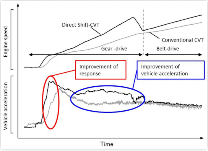 丰田direct shift CVT变速箱引入直驱齿轮系统就是为了克服传统CVT的缺点。由于CVT变速箱采用的是钢带摩擦传动,因此对动力输出必须进行限制。否则可能超出静摩擦力而出现相对摩擦,从而磨损钢带。有了直驱齿轮的direct shift CVT变速箱不再需要低速时限制发动机的输出功率和扭矩。