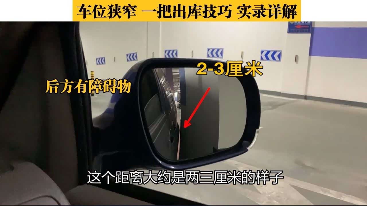 首先看一下在出库时要把车辆调整到这个姿态,也就是说车头偏左一点,车尾偏右一点,我们再从右侧后方看一下,右侧车身和柱子的距离已经很接近,