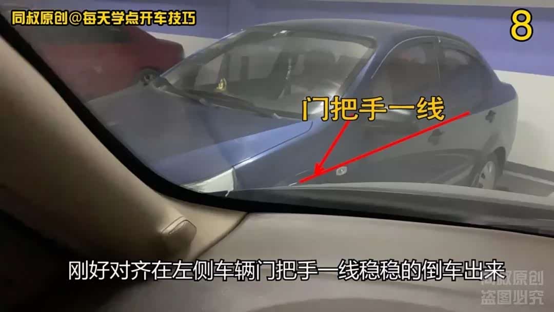 从前风挡玻璃下沿也可以看到刚好对齐在左侧车辆门把手一线稳稳的倒车出来,
