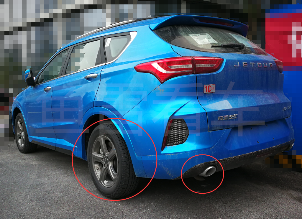 而将目光转向后侧方就能发现一些细节上的怪异,也正是这些怪异引起了笔者的关注,首现就是打红圈内的轮毂造型,这是低配的捷途X70M上的,17寸轮毂,与新款捷途X70的身段明显有着较大的违和感,也就是小脚的感觉,再注意小红圈内的假排气管后面又出现了真正的排气管口,虽说捷途X70的排气管也在同样的位置,但不至于露出一小截,这两个细节的差异本身就说明了一些问题。