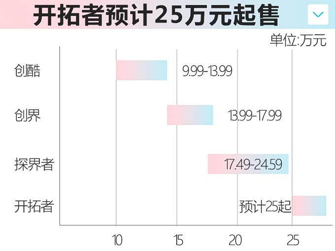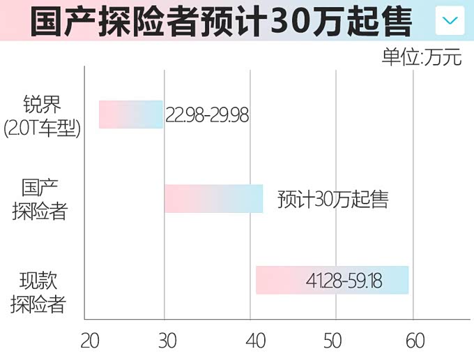 目前福特锐界2.0T顶配车型售价为29.98万元,唯一的一款2.7T车型售价为38.98万元,预计国产探险者起售价将在30万元左右,相比目前进口版的起售价下降幅度有望超10万元。