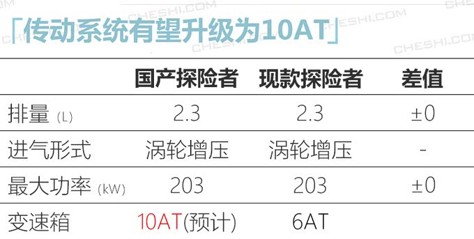 动力目前仅申报了2.3T涡轮增压发动机,最大功率与目前进口版车型搭载的2.3T发动机保持一致,均为203kW,相比大众途昂2.0T高功率版动力更强劲。另外探险者发动机的布局也从上一代的横置改为了纵置布局,传动系统预计将匹配10速自动变速箱。