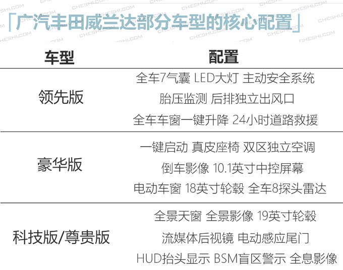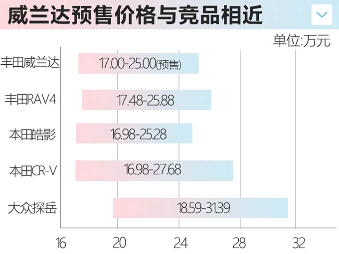 在去年的广州车展,广汽丰田发布了全新紧凑型SUV威兰达,正式进军合资紧凑型市场。威兰达现已开启预售,全系车型预售区间为17.00-25.00万元。并推出领先版、豪华版、科技版、尊贵版共四个版本的车型,其中豪华版车型预售价格区间为19.88-24.18万元。新车将搭载三种四驱系统,两种动力总成,并于今年4月正式上市,未来与丰田RAV4荣放、本田CR-V、本田皓影、大众探岳等主流合资紧凑级SUV展开竞争。