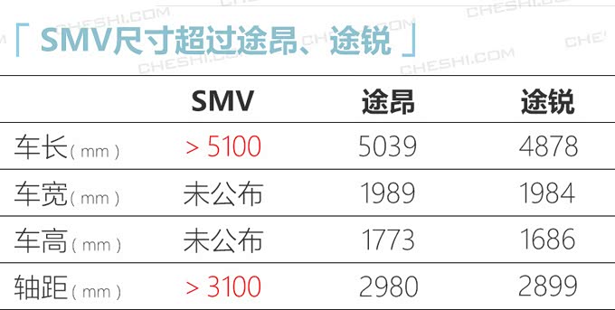 参考同平台途昂的动力,SMV将搭载2.0T(高/低功率)发动机、2.5T V6发动机,最大功率分别为162kW、137kW、220kW,峰值扭矩分别为350N.m、320N.m、500N.m,传动系统匹配7速双离合变速箱,2.0T高功率以上车型配备四驱系统。