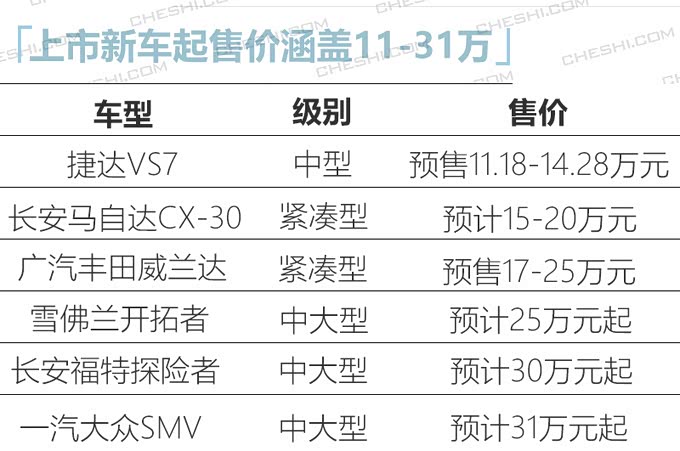 在2019年汽车市场下滑的大势下,各大厂家在SUV市场的竞争依旧火热,完善自身产品线的同时,进一步扩大市场份额。网上车市梳理出了6款即将在今年内进入市场的重磅合资SUV,包括捷达VS7、长安马自达CX-30、广汽丰田威兰达、长安福特国产探险者、雪佛兰开拓者以及一汽大众SMV。各新车在各自细分市场领域中亮点十足,其中最快2月底上市的捷达VS7预售仅11.18万元起。