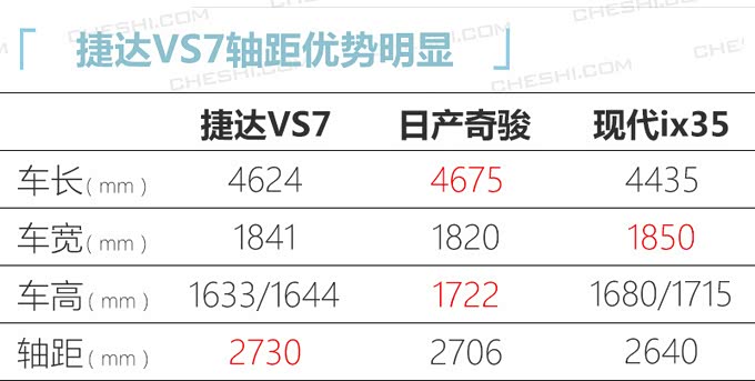 新车外观与捷达VS5保持高度一致,除了宽度外其他方面均进行了加长。VS7凭借2730mm的轴距相比日产奇骏(2706mm)、现代ix35等竞品优势明显,保证了更加宽敞的后排乘坐空间和行李厢空间。