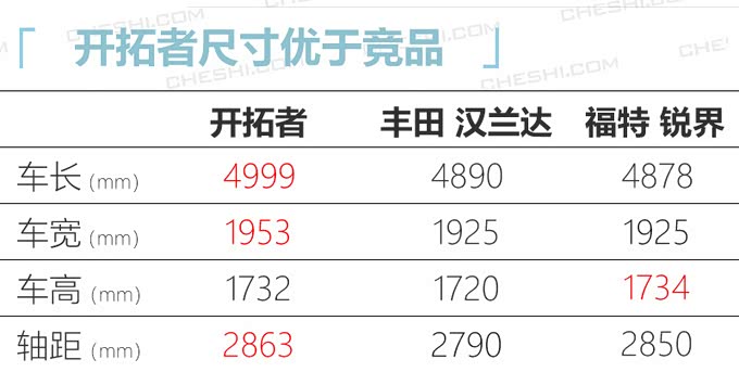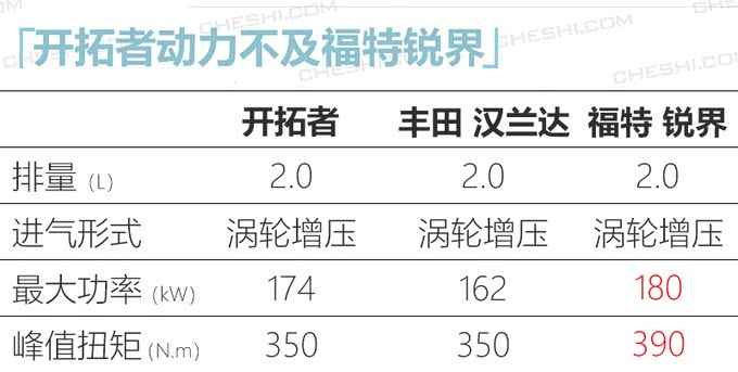 目前雪佛兰SUV产品售价区间已经覆盖了10万元-25万元,与开拓者同平台的别克昂科旗起售价为29.99万元,未来开拓者的起售价有望下探至25万元左右。在车身尺寸方面,开拓者相比汉兰达、锐界有着明显优势,动力方面搭载的2.0T发动机最大功率174kW,峰值扭矩350N.m,动力输出超汉兰达2.0T但不及锐界2.0T发动机,传动系统方面开拓者将匹配9速自动变速箱。