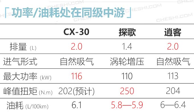 CX-30目前仅申报了搭载Skyactiv-G系列2.0L发动机的车型,数据与全新一代马自达3一致。相比竞品动力和油耗相差不大,处于同级中游水平。新车未来还将搭载全新Skyactiv-X 2.0L发动机,在动力和油耗方面会有更加亮眼的表现。