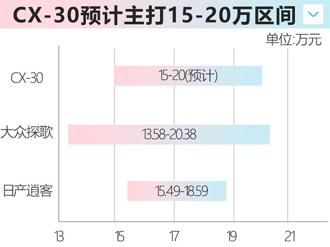 参考长安马自达3昂克赛拉2.0L三厢版本14-17万元之间的售价,而CX-30可视作马自达3两厢版,且动力一致,预计与现款三厢车价格差距不大,起售价或为14-15万元之间,新车预计在下半年正式上市。在颜值和操控等优势之上,更符合家用需求和CX-30,也将成为马自达今年销量增长的又一主力军。