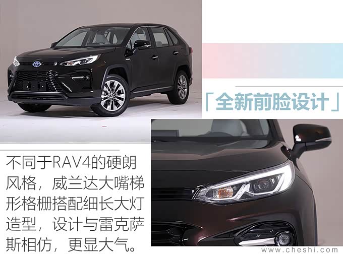 虽为RAV4荣放的“兄弟”车型,与RAV4硬派的外观有所差异,威兰达前脸更贴近雷克萨斯的“纺锤式”设计,整体走豪华精致路线,更加大气时尚,十分符合消费者的审美。内饰配备10.1英寸的悬浮式液晶屏幕,并搭载导航系统功能、智能手机互联、在线实时交通路况、云端语音识别系统,且整体用料和质感均保持着较高水准。