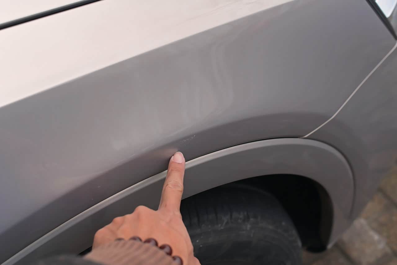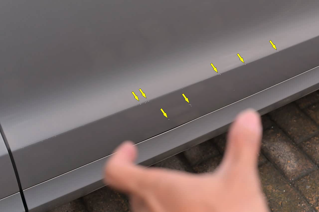 此车外观成色很好,小程序里展示的外观瑕疵也不多,但如果你蹲在车边上细看的话,其实有不少很细小的表浅磕碰伤,如果一个一个都拍照展示,估计要拍20张。但很多都是类似上图这种瑕疵。(图:右前门下筋线附近的细小磕碰伤)