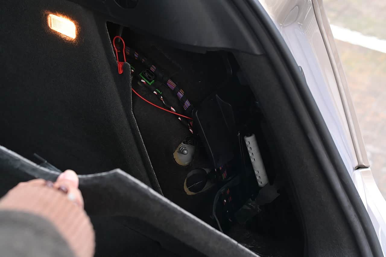 后备箱左右两侧都有这样的小挂钩,手指一抠就可以用。这个功能很方便,比如我刚擦完车的湿毛巾,可以挂在这里,刚买的烤鸭也可以挂在这里,所有不希望它倒地滚动的都可以挂在这里。