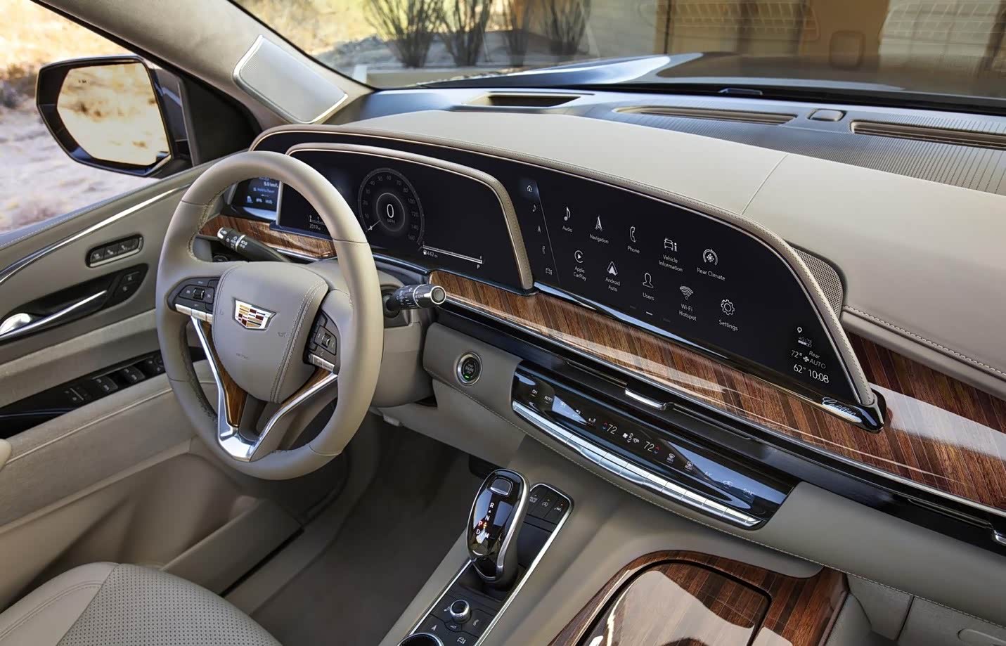 Escalade的内饰值得我们一提,方向盘左侧的7.2英寸触摸屏是驾驶员信息中心。方向盘后面是一个14.2英寸的显示屏,可容纳所有仪表和其他重要的驾驶信息。然后是16.9英寸的大型信息娱乐屏幕,和大多数笔记本电脑的屏幕一样大。当您查看整个车内设备时,当它们全部打开,你会感觉到一种压倒性的气场。