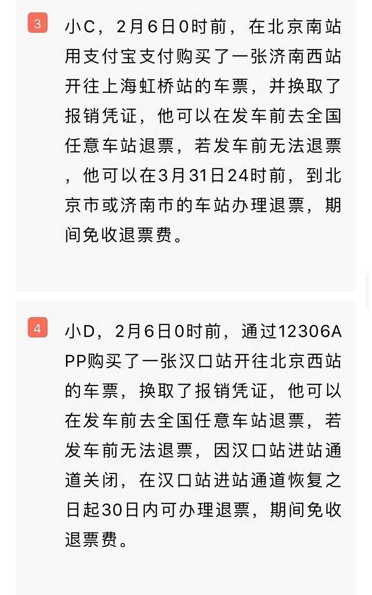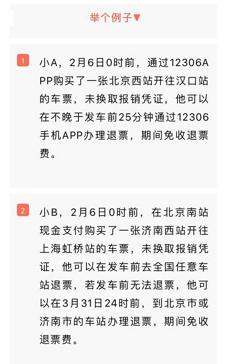 凡是于2月5日24时前使用现金购票或换取纸质车票(含报销凭证)的旅客,如因1月23日后车站封闭,开车前无法到车站办理退票的,可延期至3月31日24时前办理退票。