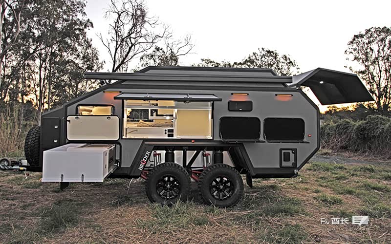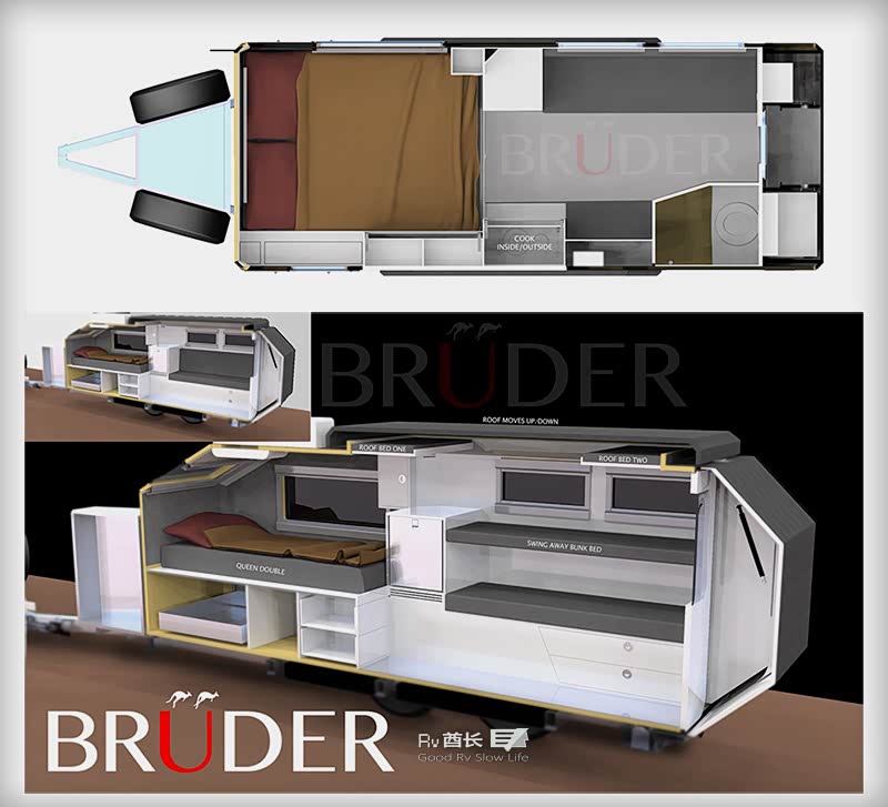 布鲁德Bruder的名字来自德语,意思是兄弟。是来自澳大利亚的兄弟两人建造的军工级越野拖挂房车品牌。创始人拥有近十年的从事研发军用设备及户外用品的经验,致力于打造舒适性最高的越野拖挂。布鲁德Bruder刚刚发布了最新款的EXP-6 GT,与旧版不同之处在于之前的弹出式车顶升级为硬顶,拥有更高的车身及舒适的内部空间。