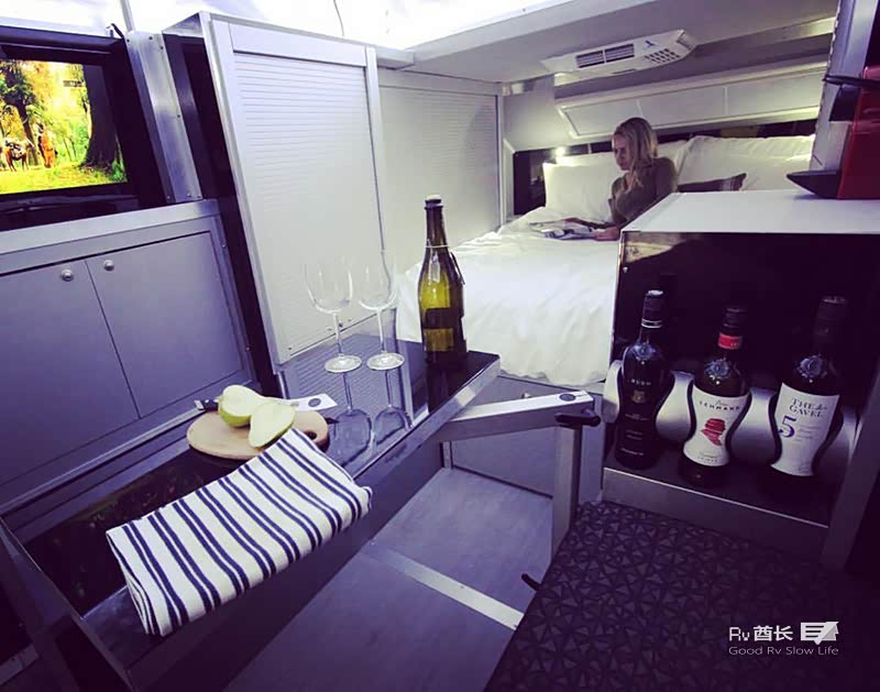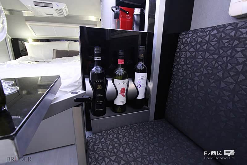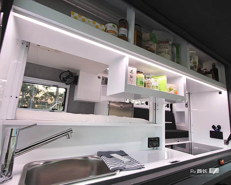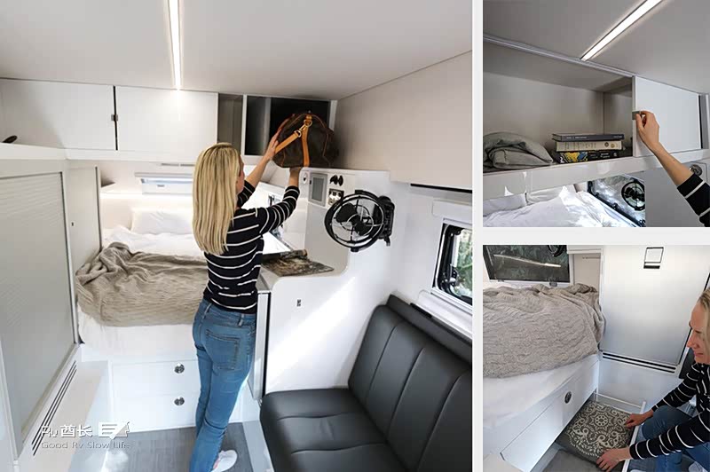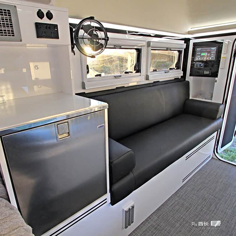 厨房也是该车型最大的亮点之一,厨房区域可以供车内或户外使用。在车的内部也可以使用厨房的设备,外部提供了一个独立的抽拉式冰箱,内部也拥有一个单独的冰箱。遮阳蓬长3.5米,可以电动遥控,最新款尾部还配置了一台小型洗衣机。EXP-6 GT标配225AH的锂电池,600W的太阳能以及带有12V充电口和USB插座。170升水箱,柴油热水器,室外冷/热水淋浴。所有的配置都可以定制化,客户可以根据自己的需求来增加所需要的配置。
