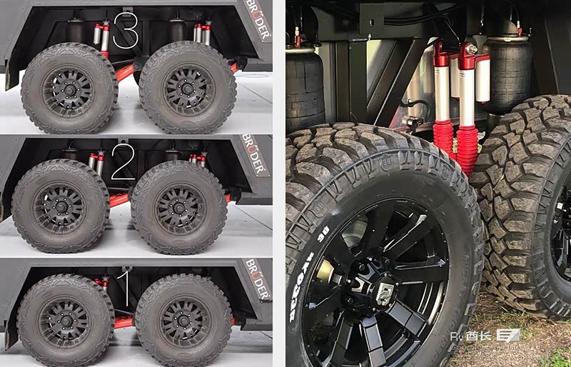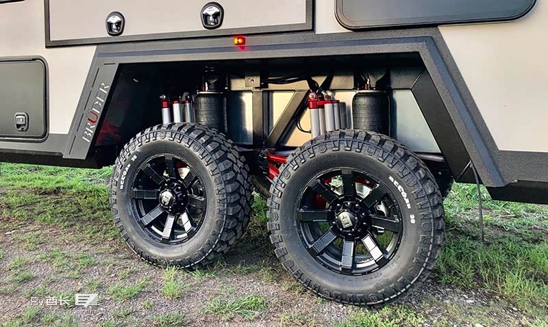 使用能够承受自身重量11倍的气密镀锌底盘。可调式多连杆悬挂系统,可调节每个车轮的悬架,每个车轮均带有双遥控碳罐单管减震装置,可调节30cm的高度,有助于EXP-6 GT保持与地面的接触,从而获得更舒适,稳定的行驶。该系统可以单独控制每个车轮的高度,默认拥有三个常用的可调节高度,甚至如果环境需要,你可以把这台双轴的拖挂房车改成单轴使用。在崎岖的山路驻车时,也可以更加方便的为车内提供一个水平的位置的状态。