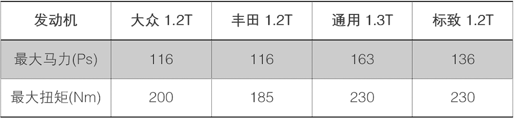 从下表可以看出,这些小排量涡轮增压发动机的账面参数都不算弱,就算是马力值最小的大众和丰田,都达到了1.6L自然吸气发动机的水准,并且在最大扭矩方面还远超1.8L自吸发动机。通用1.3T更是把最大马力提升到163匹,这已经是2.0L自吸发动机的水准。