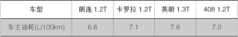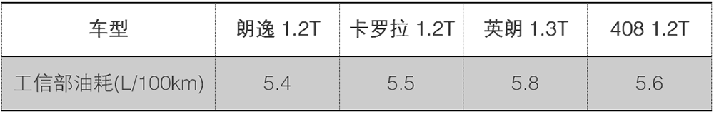 按照下表,四款车的理论油耗从高到低排序为:英朗1.3T、408 1.2T、卡罗拉1.2T、朗逸1.2T。