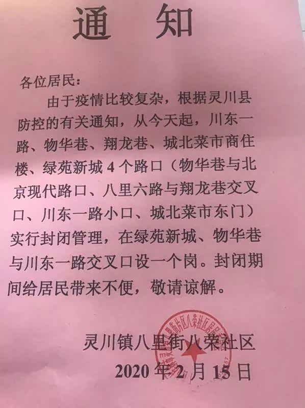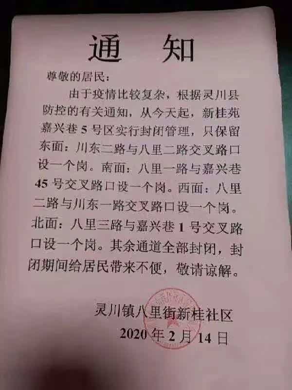 由于疫情比较复杂,根据灵川县防控的有关通知,从今天(2月15日)起,工商小区、九龙巷、金山阁、元宝巷、毓凤巷、林业小区、732 生活区8个路口(川东一路4个口,八里四路南面 1个口,西面2个口,八里五路与灵川大道交叉口封闭)实行封闭管理,在八里五路与川东一路交叉口设一个岗。封闭期间给居民带来不便,敬请谅解。