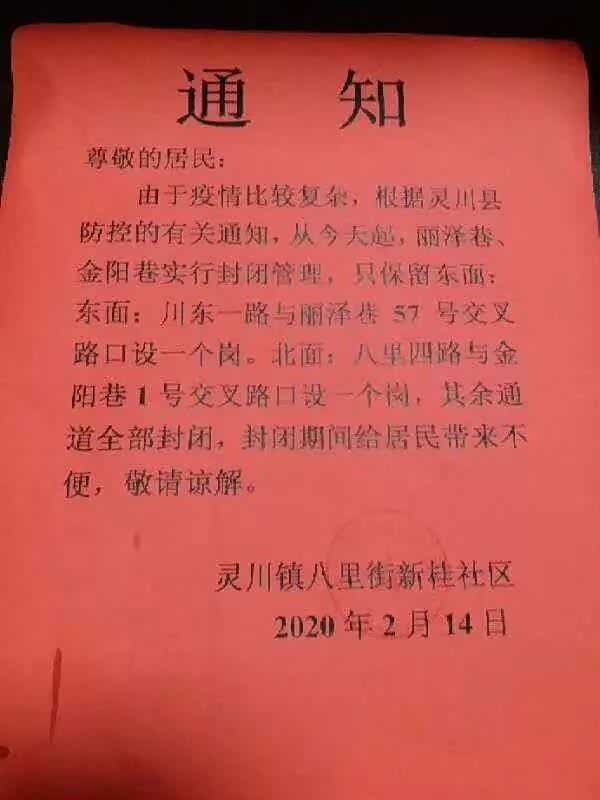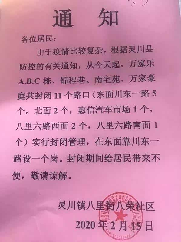 由于疫情比较复杂,根据灵川县防控的有关通知,从今天起,万家乐A.B.C 栋、锦程巷、南宅苑、万家豪庭共封闭 11 个路口(东面川东一路 5个,北面2个,惠信汽车市场1个,八里六路西面2个,八里六路南面 1个)实行封闭管理,在东面靠川东一路设一个岗。封闭期间给居民带来不便,敬请谅解。