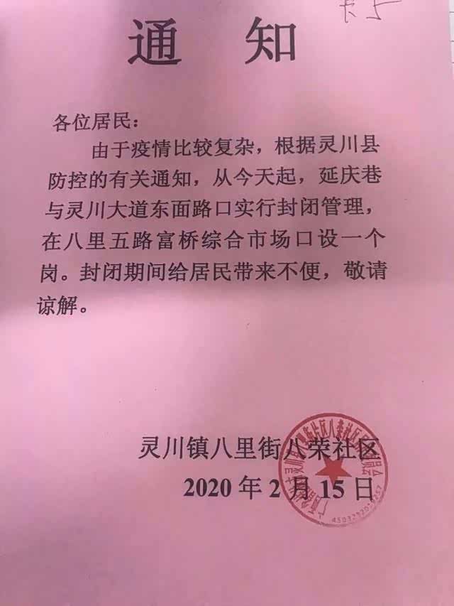 由于疫情比较复杂,根据灵川县防控的有关通知,从今天起,延庆巷与灵川大道东面路口实行封闭管理,在八里五路富桥综合市场口设一个岗。封闭期间给居民带来不便,敬请谅解。