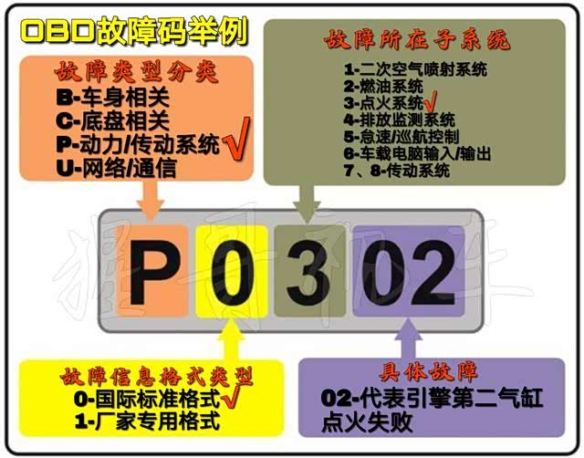 P0302故障码=P(动力/传动系统类故障)+0(国际标准格式故障)+3(点火子系统)+02(引擎第二缸点火失败)=您的爱车出现“动力系统中引擎第二缸点火失败”故障