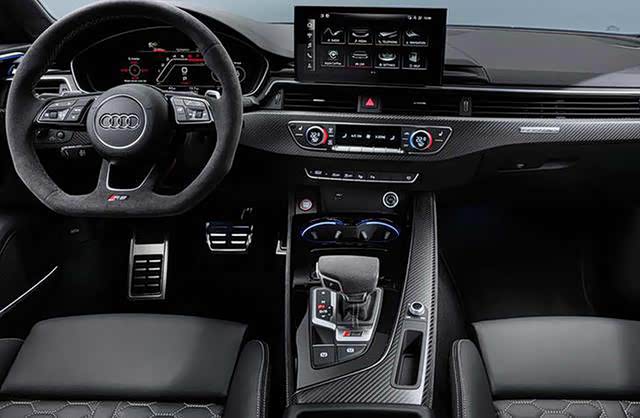作为奥迪RS级别的车型,车内一定会采用大量的碳纤维面板装饰,配合这个翻毛皮的方向盘,整个车内的氛围看上去也会更加运动很多。新款的奥迪RS5会配备一块尺寸更大的MMI液晶中控屏,方便日常驾驶时更直观的查看车辆的状态。