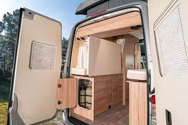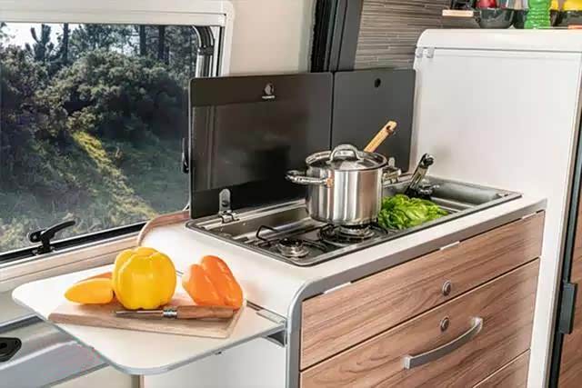 在进门的左手边是车内的厨房区域,配有一体式煤气灶和水槽组合灶台,带有玻璃盖覆盖,使厨房能有一个宽大的工作表面。旁边还带有一个小型拓展台。